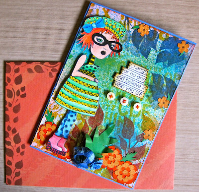 Wow...there is a lot going on with this card! I used my Dylusions Spray Inks to colour the background and spritz the "alphabet" stencil. I then used the leaf stamps from the "Doodle Parts" Dylusions stamp set around the edges to finish off the background. The girl was actually from two different Dylusions stamp sets. The head came from "Traveling Travis" and the body came from "Pondering Petunia". I coloured those up with some old pencil crayons and glued them together earning me +83 necromancy exp points. The sentiment came from the "Say What You Mean" Dylusions stamp set.
